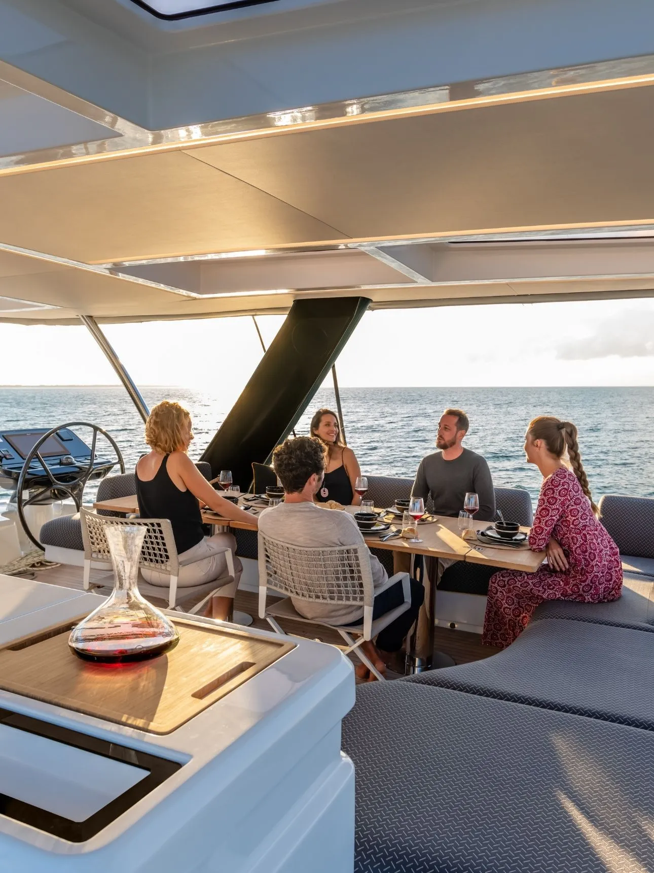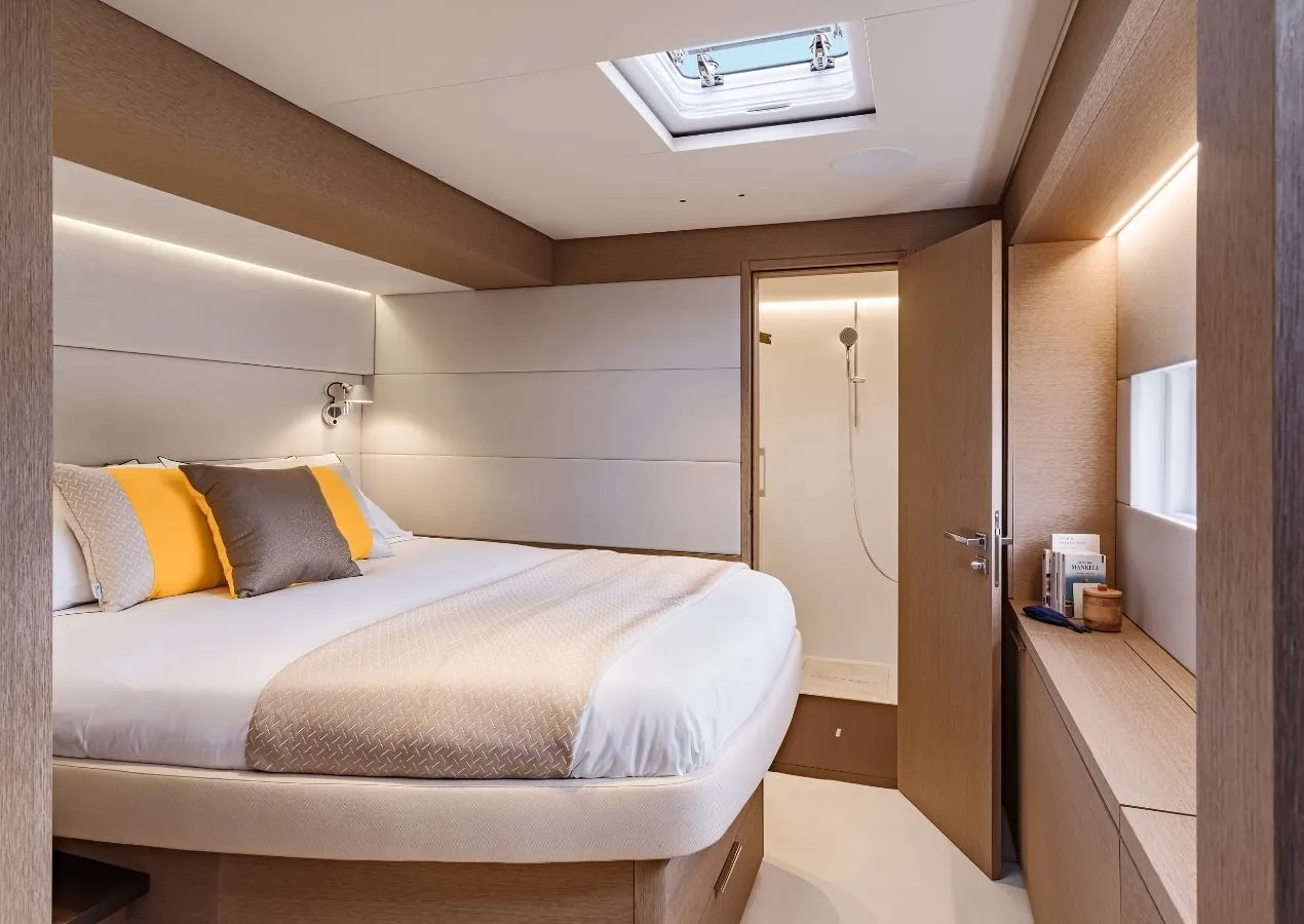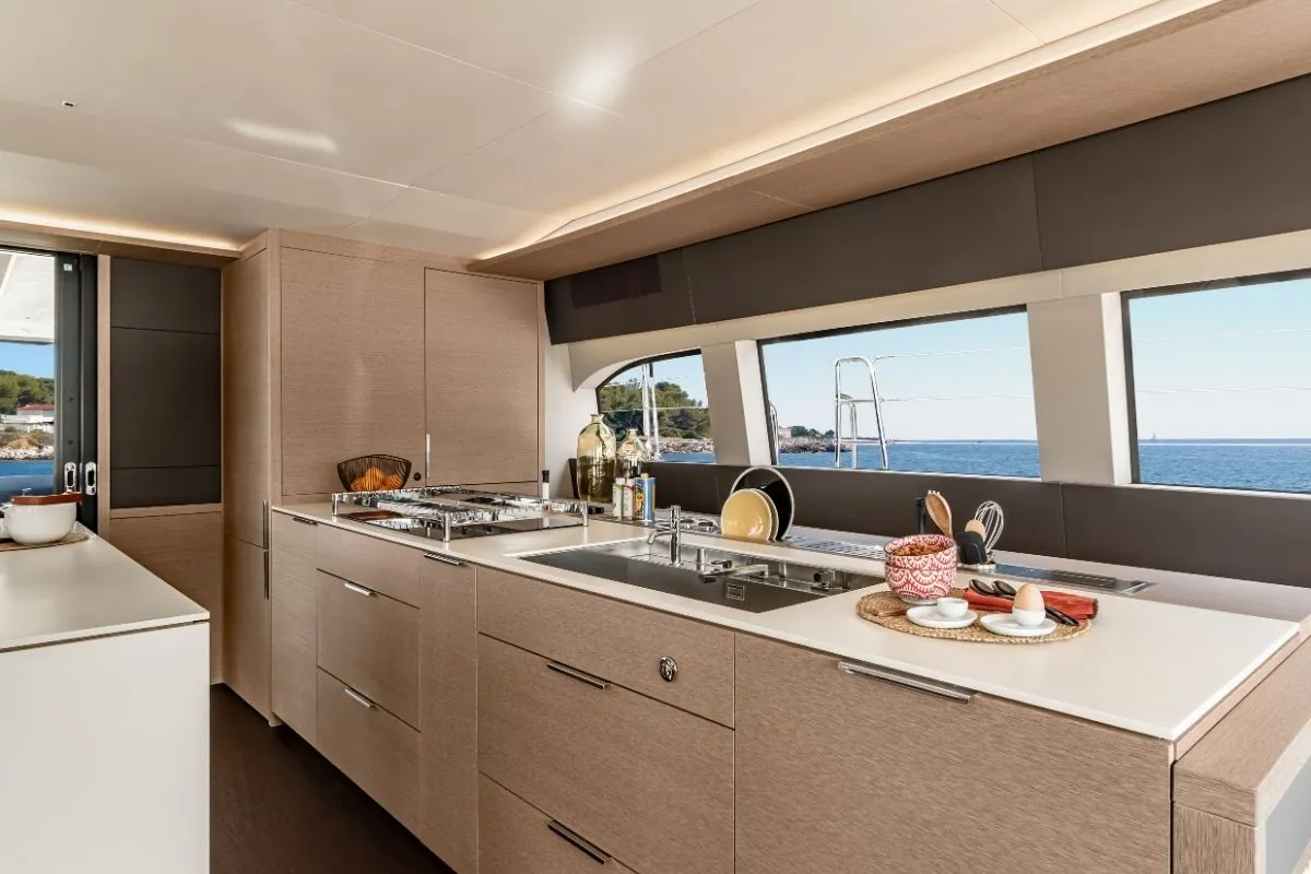 As a Lagoon Sixty 5, Aura offers an extraordinary sense of space: from her expansive flybridge to the open-plan salon framed by panoramic windows.