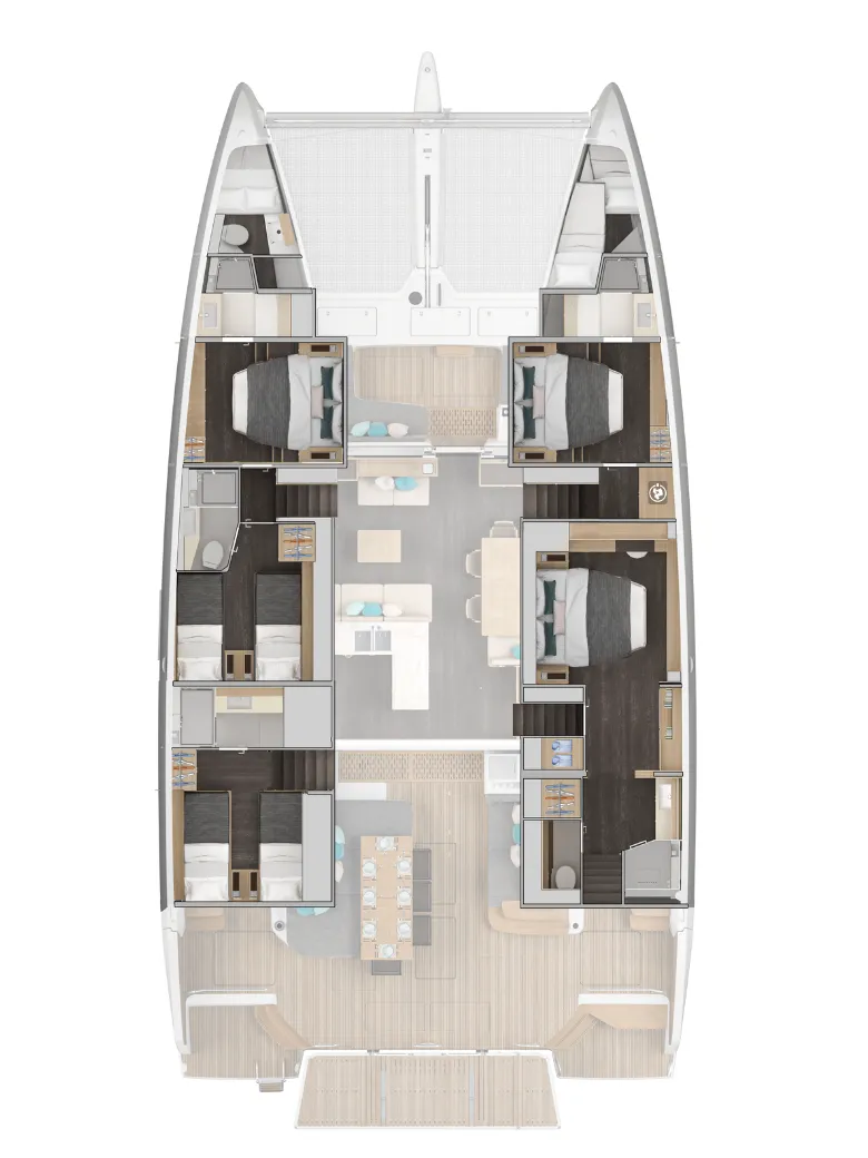 All our catamarans are Lagoon models, built by the industry-leading shipyard specializing in high-quality catamarans. They feature spacious cabins, private bathrooms, air conditioning, Wi-Fi, indoor and outdoor relaxation areas, water sports equipment, and much more.